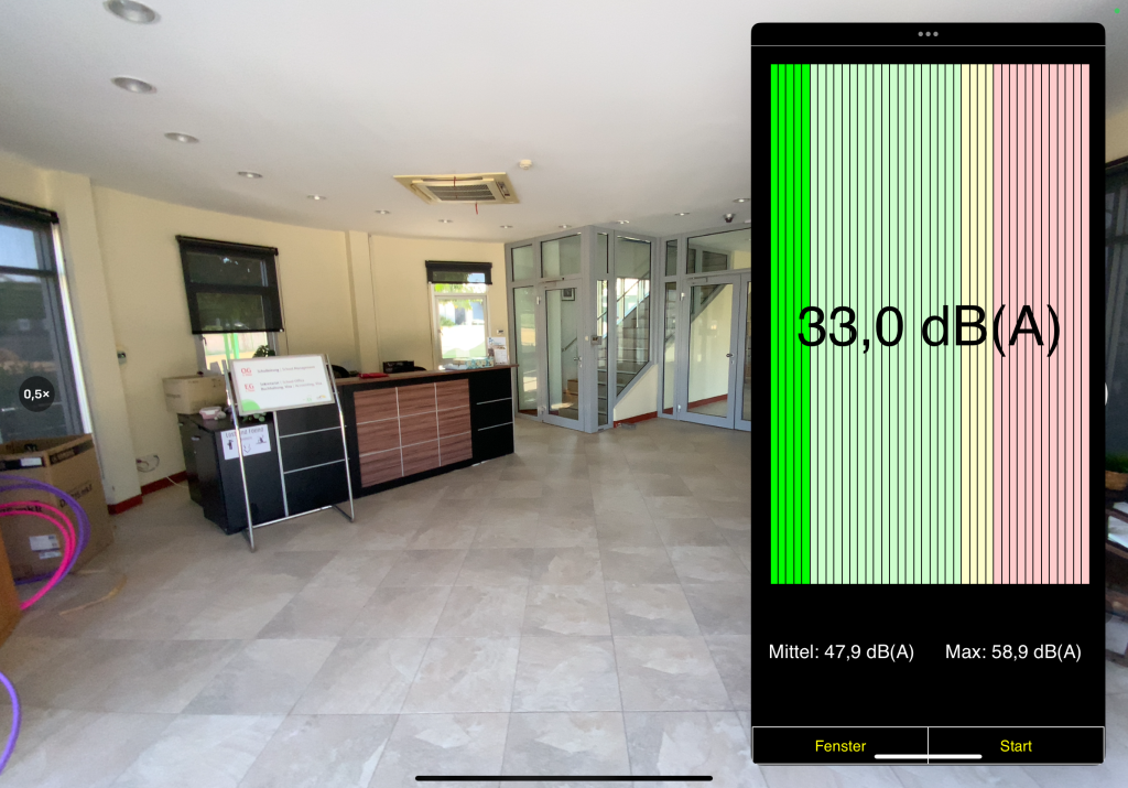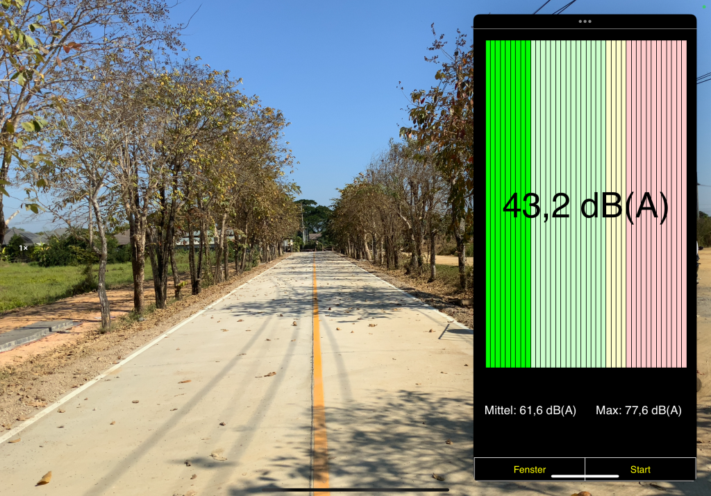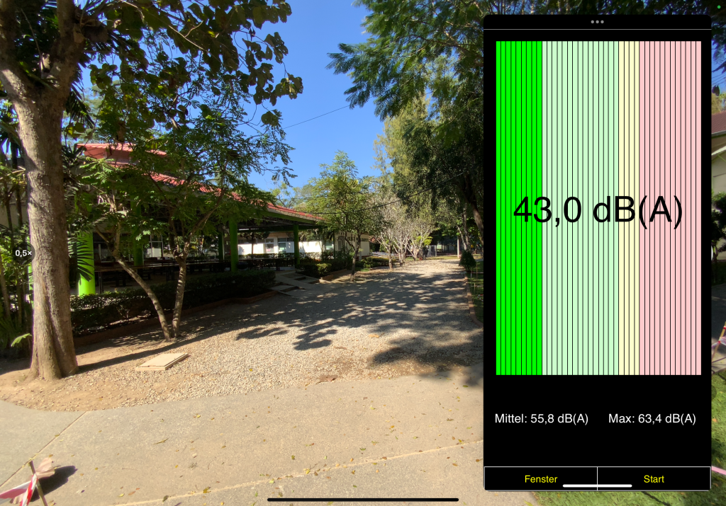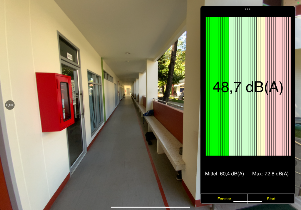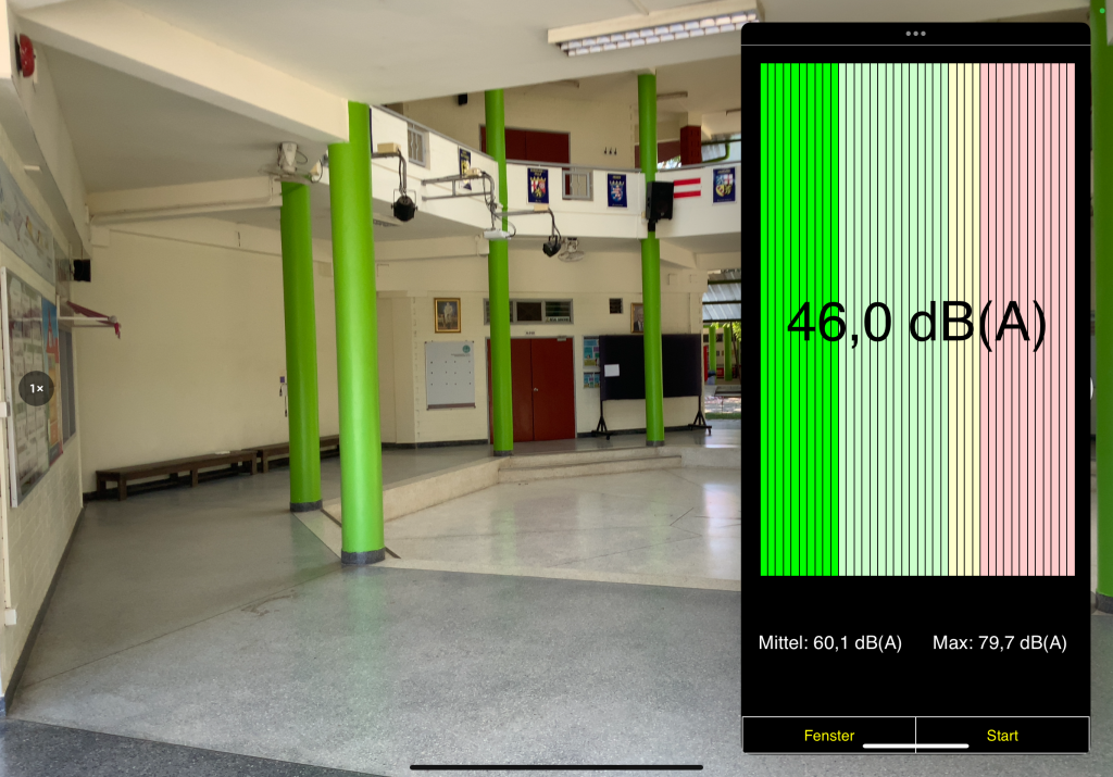 Die Durchführung erfolgte mithilfe von Tablets, auf denen die Schüler:innen interaktive Inhalte wie Videos, Quizaufgaben und Schallpegelmessungen bearbeiteten. Trotz kleiner technischer und sprachlicher Herausforderungen, wie etwa instabilem WLAN oder Verständnisschwierigkeiten bei nicht deutschsprachigen Schüler:innen, zeigten sich die Lernenden motiviert und interessiert. Besonders spannend war für viele die praktische Messung der Lautstärke auf dem Schulhof mit einer App und die anschließende Auswertung. Wie in den Abbildungen 3 bis 7 zu sehen ist, kann eine solche Messung auf dem Schulgelände konkret aussehen. *Die bildlich dargestellten Messungen wurden am Wochenende aufgenommen, um keine Personen im Bild zu zeigen.*