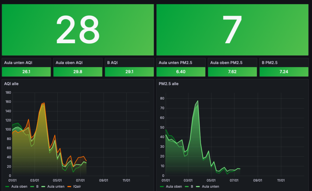 Um die Gesundheit der Schüler:innen zu schützen, hat die CDSC drei Luftsensoren auf dem Schulgelände installiert: einen am Gebäude B und zwei in der Aula – einen im Erdgeschoss und einen im oberen Stockwerk. Diese messen alle fünf Minuten die Luftqualität. Der aktuelle Durchschnittswert des Luftqualitätsindexs (LQI, engl. Air Quality Index – AQI) aller drei Sensoren wird auf einem Bildschirm im Aula angezeigt. Dieser kann auch online abgerufen werden (siehe aktueller LQI der CDSC).