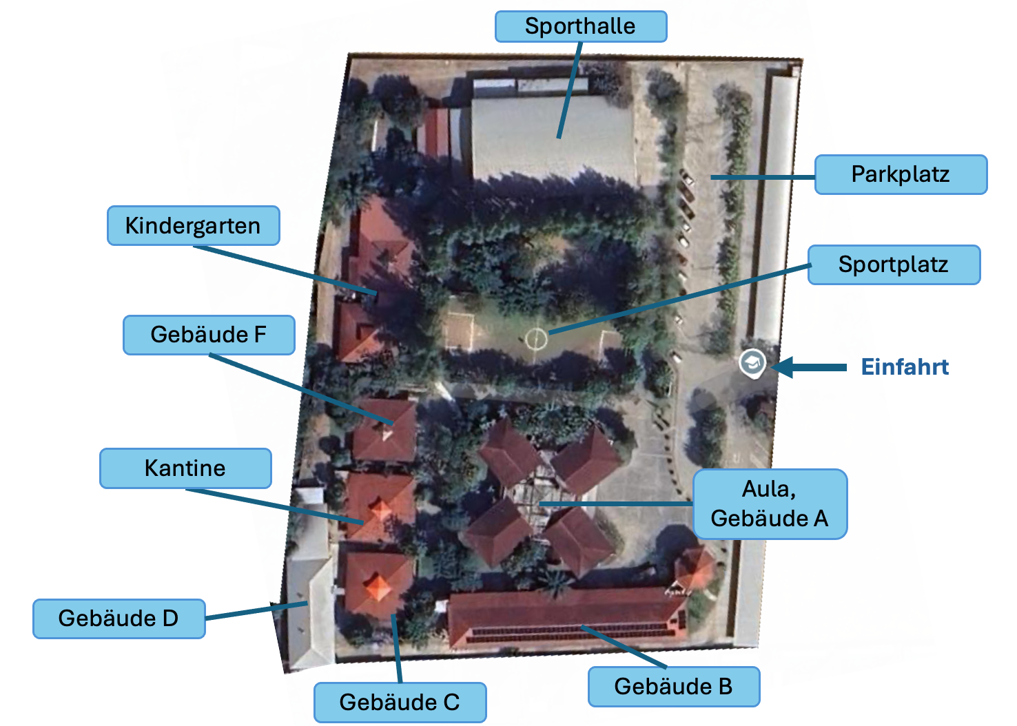 Die CDSC ist eine anerkannte deutsche Auslandsschule, die Bildung vom Kindergarten bis zum Abitur anbietet. Im Schuljahr 2024/25 besuchten 69 Kinder den Kindergarten und 221 Schüler:innen die Schule. In jeder Jahrgangsstufe gibt es nur eine Klasse, was zu einer familiären Atmosphäre führt und enge Beziehungen zwischen Lehrkräften und Lernenden ermöglicht. Das Schulgelände ist in Abbildung 1 in einer Satellitenansicht dargestellt.