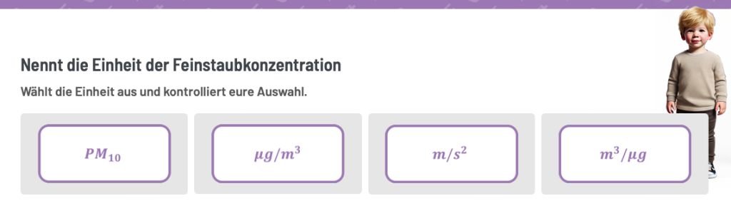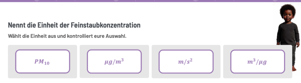 Im Rahmen meiner Masterarbeit entwickelte ich den ersten Teil einer neuen digitalen Lerneinheit zum Thema Feinstaub, die derzeit im Projekt Humboldt-Explorers entsteht. Ziel war es, nicht nur fachliches Wissen über Feinstaub und dessen Auswirkungen zu vermitteln, sondern auch die intrinsische Motivation der Schüler:innen durch Diversitätsdarstellungen gezielt zu fördern. Die Lerneinheit bestand aus einem Erklärvideo und interaktiven Quizaufgaben und wurde in den Klassenstufen 9 bis 12 an der CDSC erprobt. Abbildung 8 zeigt beispielhaft eine Quizaufgabe aus der jeweiligen Lerneinheit und veranschaulicht, wie diese aufgebaut war.